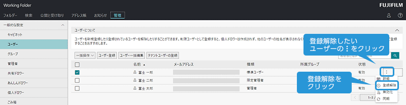 ユーザーを登録解除するには、ユーザーの個人ドロワーが空になっている必要があります。また、個人ドロワーが空になっている場合でもごみ箱にファイルが残っている場合は登録解除できません。