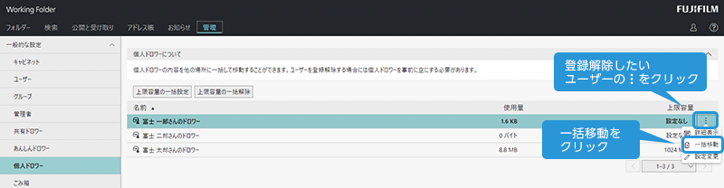 削除したいユーザーの個人ドロワー内にあるファイルやフォルダーを別のドロワーまたはフォルダーに一括で移動します。