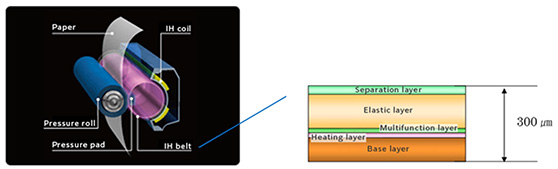 This led to a technology overhaul focusing on the IH belt inside the fuser. We considered utilizing copper in the heating layer of the IH belt. Up until then, copper was thought unsuitable for induction heating, but we found that it can be heated dramatically rapidly to the same extent as magnetic metals by thinning. Utilizing this, we developed an IH belt with ultra-thin (3 micrometer) copper layers—one of the thinnest in the world—enabling rapid heating.