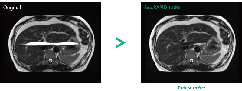 When the size in the phase encoding direction is incorrectly set , the signal outside the FOV will fold back and appear as artifacts in the image. Exp. RAPID reconstructs the image according to the specified FOV magnification ratio. Artifacts can be removed in post-processing.
