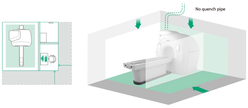 The ECHELON Synergy ZeroHelium does not require a quench pipe, which alleviates height installation constraints. In addition to the footprint of the equipment, the machine room area, including the ZeroHelium control unit, has been carefully designed to be equivalent to that of conventional wide-bore products.