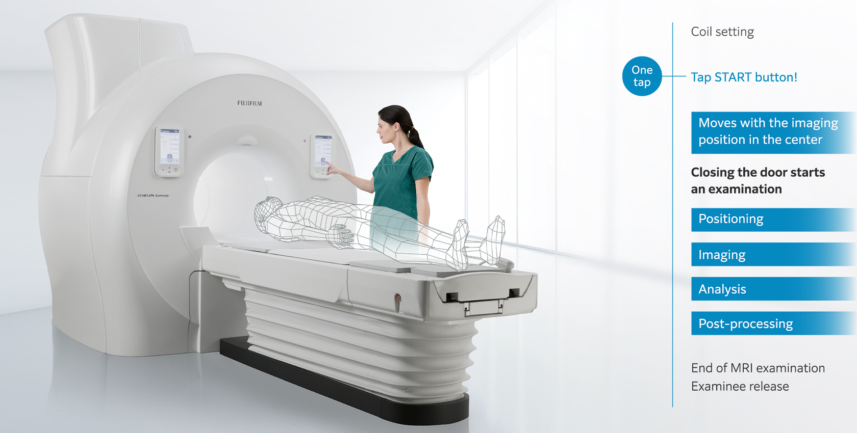 MRI examinations require a wide range of operations, MRI Examinations require a wide range of operations from selecting the protocol, coil selections, and positioning. FUJIFILM makes the workflow easier and more flexible. FUJIFILM has created ECHELON Synergy with such a desire in mind.