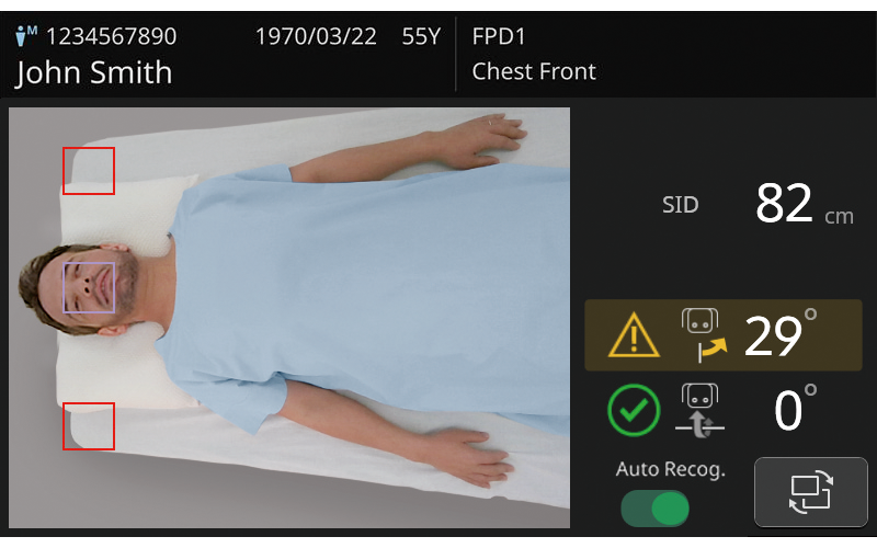 The camera built into the collimator provides live imaging display of the patient via the Tube head monitor for improved patient monitoring. The camera also allows detection of SID, angulation and alignment to enhance patient positioning.