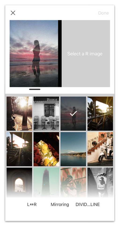 • By pulling the Frame Advance Lever between shots, it becomes easy to create a composite photo combining two vertically composed images, similar to a half size camera, with the “2in1” feature. Photo sequences can also be created by combining videos with videos or videos with still images*10. Additionally, the dedicated “X half” app enables the creation of collages. Furthermore, within the app, elements such as changing the color and size of the dividing line or swapping the left and right images can be easily and intuitively edited.