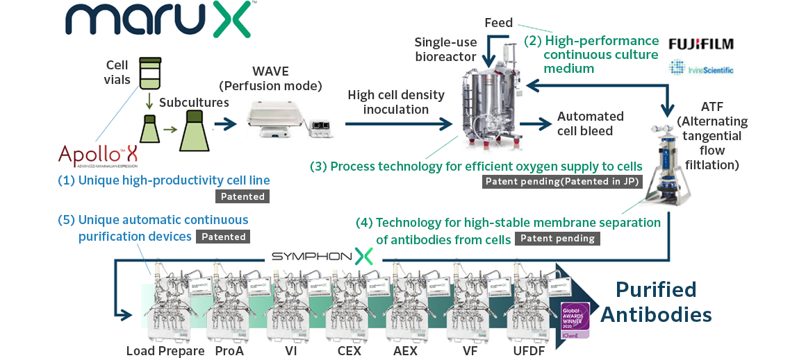 We have the continuous production MaruXTM process, which is based on five technologies: (1) ApolloXTM , our proprietary cell line with high productivity, (2) high-performance continuous culture medium (manufactured by FUJIFILM Biosciences, a group company engaged in the culture medium business), (3) a culture process that supplies oxygen to high-density cells at high efficiency, (4) a membrane separation process that stably separates cells and antibodies over a long period of time, and (5) SymphonX , an automated continuous purification system developed by our company (Fig. 2). In addition to the development of scale-up technology for mass production, FUJIFILM Biotechnologies, a group company engaged in bio-CDMO business, is introducing cGMP production equipment.
