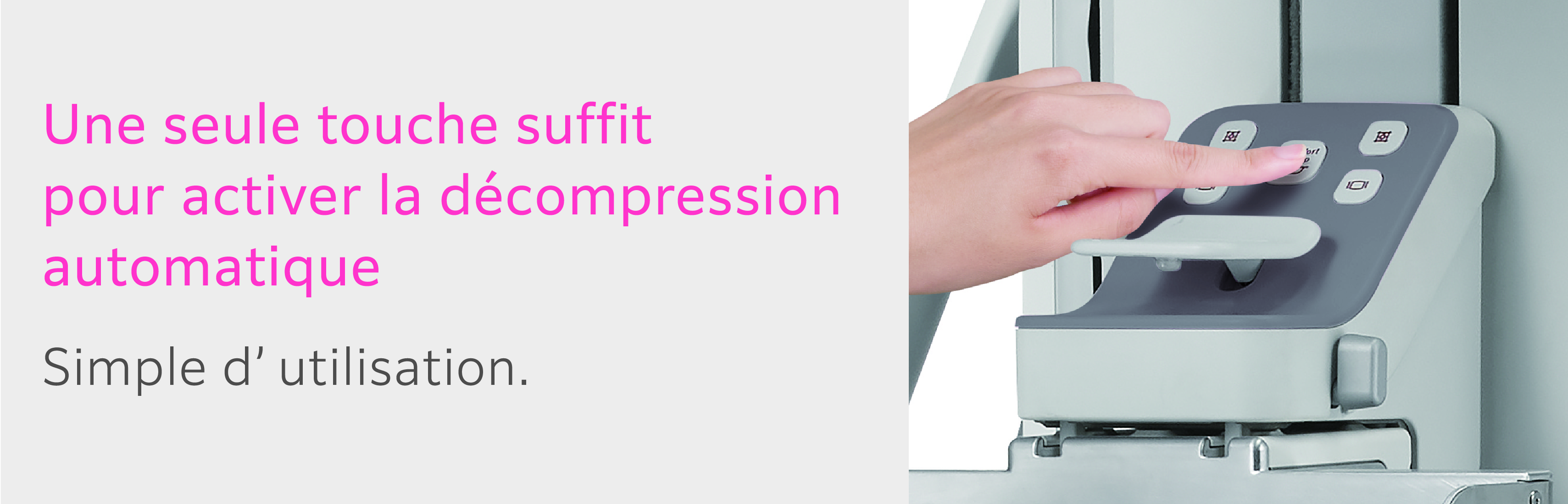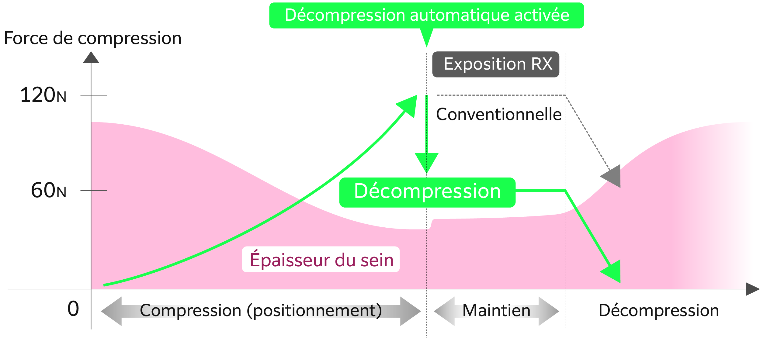 This function reduces the compression pressure within the range (± 3 mm) where the thickness of the breast does not change after the completion of normal breast compression and therefore reduces the pain of the examinee. The hysteresis* phenomenon is used to reduce the time that the pressure is at maximum pressure compared to normal compression methods.