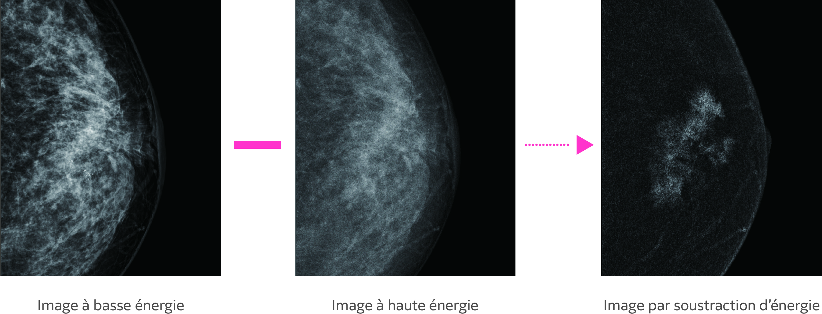 Acquisition en continu d’une image à basse tension (basse énergie) proche de la mammographie conventionnelle et d’une image à haute tension (haute énergie) avec un filtre Cu, dans une même compresssion. Le logiciel génère une image de soustraction d’énergie automatiquement.