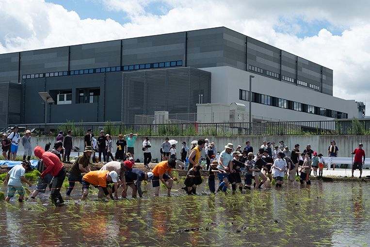 Employees of the Fujifilm Group plant rice in a groundwater irrigation field in Kikuyo Town, Kumamoto Prefecture, Japan