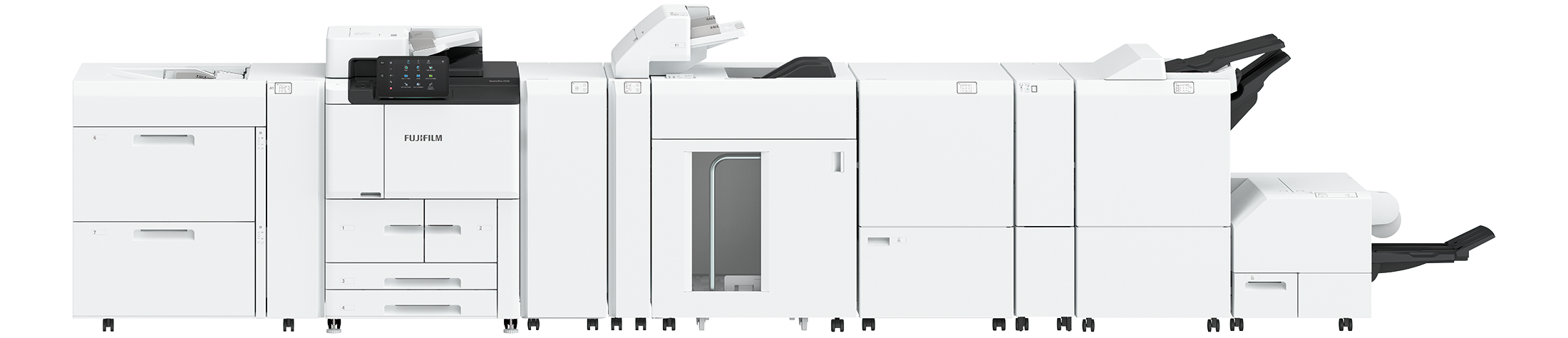 - *2 Bitte wenden Sie sich an unseren Vertriebsmitarbeiter, wenn Sie eine Papierzufuhr oder ein Ausgabemodul für den Druck von Bannerblättern benötigen.