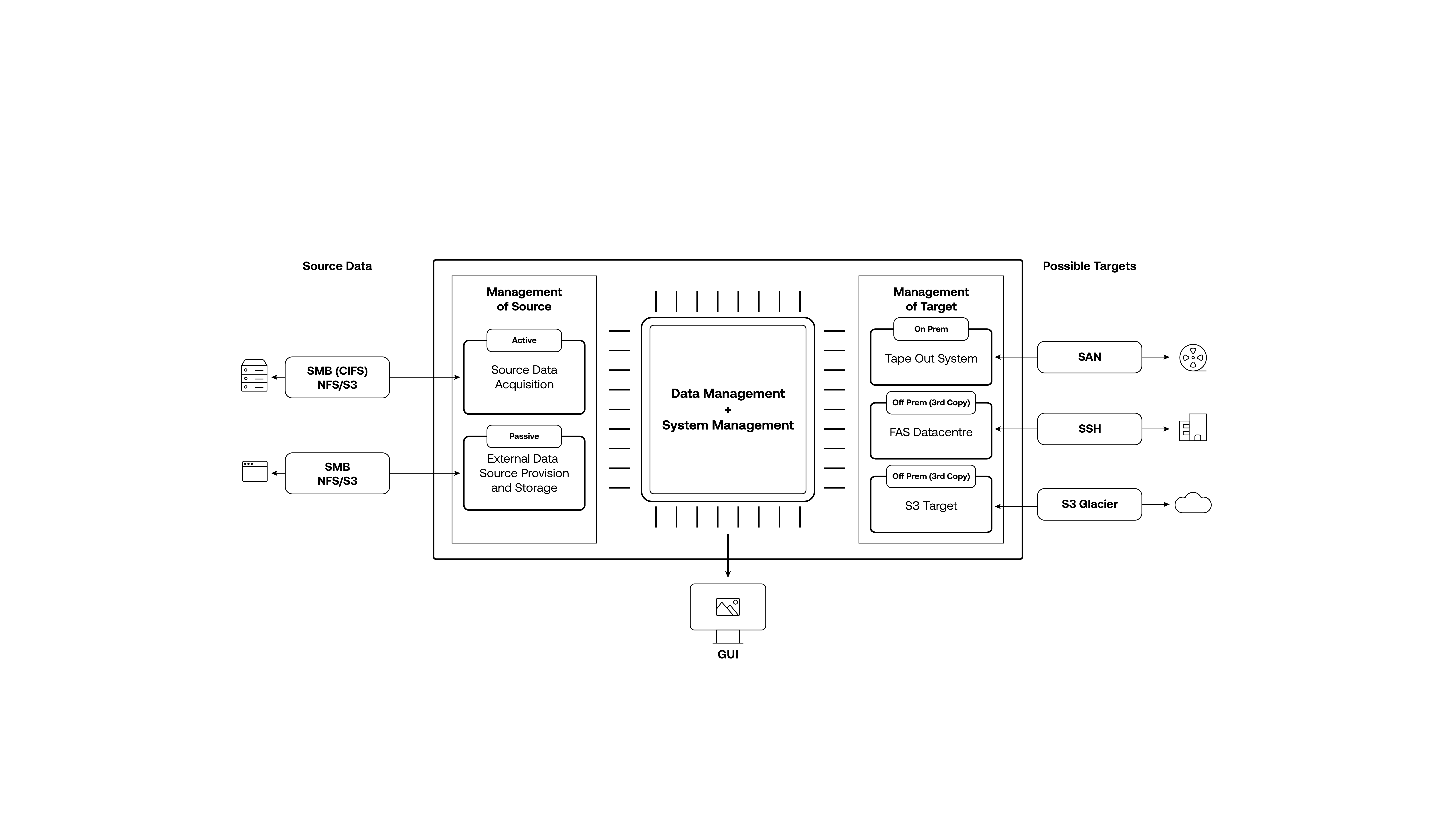 FUJIFILM Object Archive software is both a data and system management software. It offers a multi-source/multi destination operation and is compatible with all standard IT infrastructures (SMB (CIFS), NFS, S3).