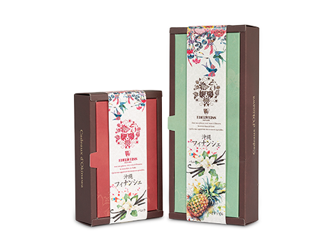 作品説明:沖縄土産の洋菓子フィナンシェのパッケージ用帯として制作。沖縄伝統の紅型と、フィナンシェに使用される沖縄県産の食材(バニラ、パイナップル)をテーマにデザインしています。エンボス紙の質感と透明感を活かした仕上げにより、手触りの良さを実現し、高級感あふれる紙箱と調和したパッケージとなっています。