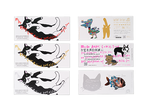 作品説明:アールブリュット作家兼デザイナーの荒木麻奈さんによる個展案内のダイレクトメールです。猫のイラストをキービジュアルに、特殊トナーを用いた手書きタイトルで華やかなアクセントを加えています。特殊色の活用により、メタリックな輝きと多彩なバリエーションを実現しています。