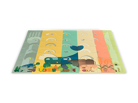 作品説明:1960年から2023年までの米、小麦、牛肉、魚など主要食品の国内生産量、輸入量、輸出量、ならびに国民1人/1日あたりの供給粗食量を、イラストを用いたダイアグラムで表現した作品です。特殊色を使用した長尺印刷、印刷のズレを防ぐ精密な調整(レジ合わせ)などの高度な技術を駆使して一連の作品に仕上げています。時代ごとに変化する日本の食生活の推移を、視覚的にわかりやすく再現しています。