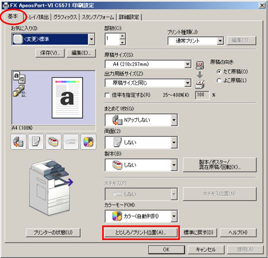 - [印刷設定] ダイアログの [基本] タブの [とじしろ/プリント位置] ボタンをクリックする。