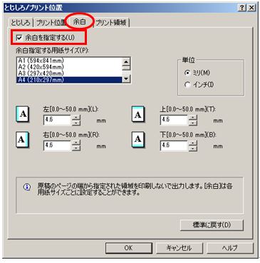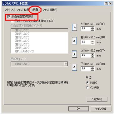 - [とじしろ/プリント位置] ダイアログの [余白] タブをクリックする。