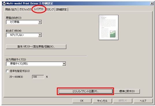 - [印刷設定] ダイアログの [レイアウト] タブの [とじしろ/プリント位置] ボタンをクリックする。