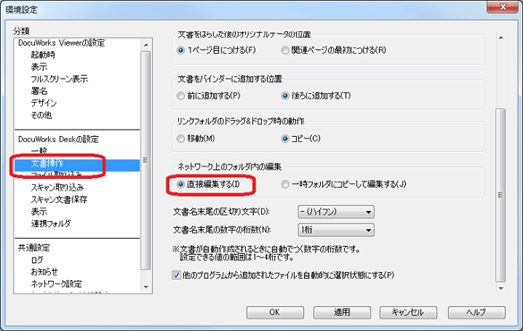 - [環境設定]画面で、[DocuWorks Deskの設定]の[文書操作]を選択し、[ネットワーク上のフォルダ内の編集]を[直接編集する]に変更します。
