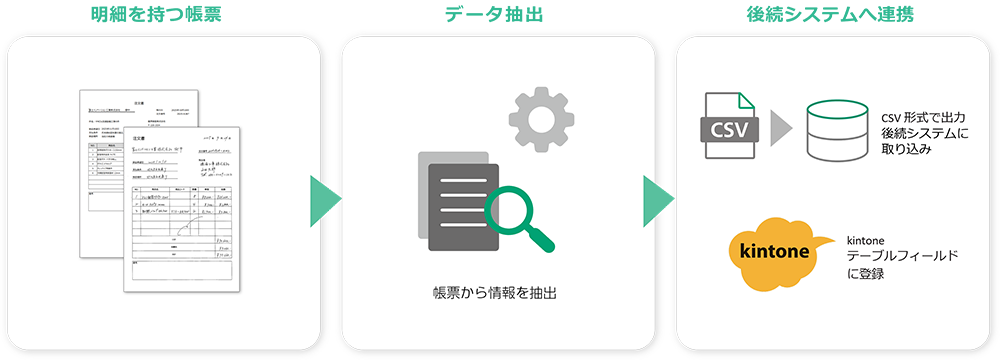 抽出された構造化データを、後続システムにインポート可能な形式で出力できるため、データの加工・編集の手間なく、販売や会計システムなどにそのままデータを取り込めます。また、サイボウズ社の「kintone」には「FUJIFILM IWpro」から直接データを登録することが可能です。これにより、受注登録や支払い・仕訳などの後工程をスムーズに処理できます。