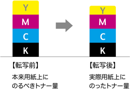 プリンターでは、CMYKそれぞれの色のトナーを重ねることで表現したい色を再現し、また重ねるトナーの量によって再現される色が変化します。しかし図1に示すように、転写前のトナー量と転写後のトナー量が変わってしまうことで、色再現が正しく行われない場合があります。これは、トナーを用紙に転写する時の特性などが変化し、転写されるトナー量が変動することで発生します。