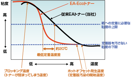 EA-Ecoトナーは、温度に対してシャープに粘度が変化する特性を持たせることで、低い温度でも粘度が十分低くなり、最低定着温度を従来トナーより約20℃下げることを達成しています。