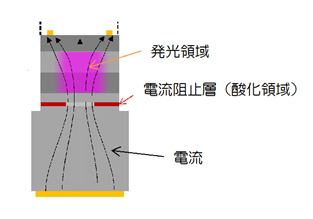 当社独自開発のVCSELにおける電流狭窄構造の製造技術を応用し、発光部に電流阻止層(酸化領域)を形成することで、発光領域を中央部に集めます。従来発光部の側面に流れていた発光に寄与しない電流が抑制され、従来と同じ電流を使用した場合でも、約3倍近くの光量を出力することができ、省電力化と効率化を同時に実現しました。