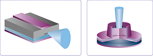 Vertical Cavity Surface Emitting Laser=垂直共振器型面発光レーザーをVCSELと呼びます。従来の半導体レーザー(端面発光レーザー)は、半導体基板の端面に反射鏡があり、基板に対して平行方向に光を出射します。一方VCSELでは基板に対して垂直方向に反射鏡があり、この向きに光が出射します。