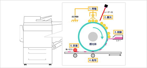 1.帯電→2.露光→3.現像→4.転写→5.定着という5つのプロセスでプリントを行います。