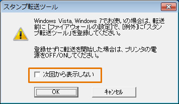 スタンプ転送ツールの起動時に、登録をお願いするダイアログが表示されます。まだ登録されていない場合は、「キャンセル」ボタンを押して登録してください。その際、「次回から表示しない」をチェックすると、次の起動時からこのダイアログを表示しません。
