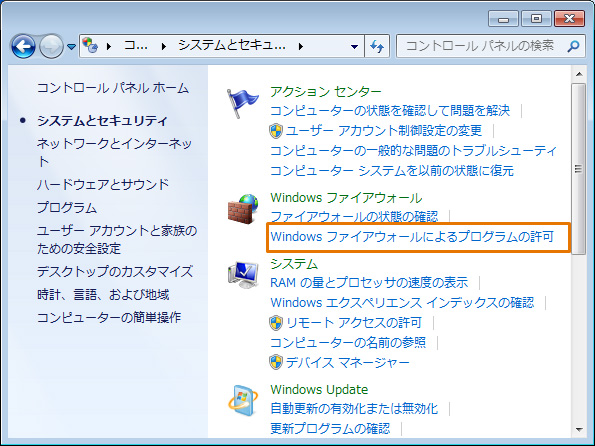 - [Windowsファイアウォールファイアウォールによるプログラムの許可]を選択します。