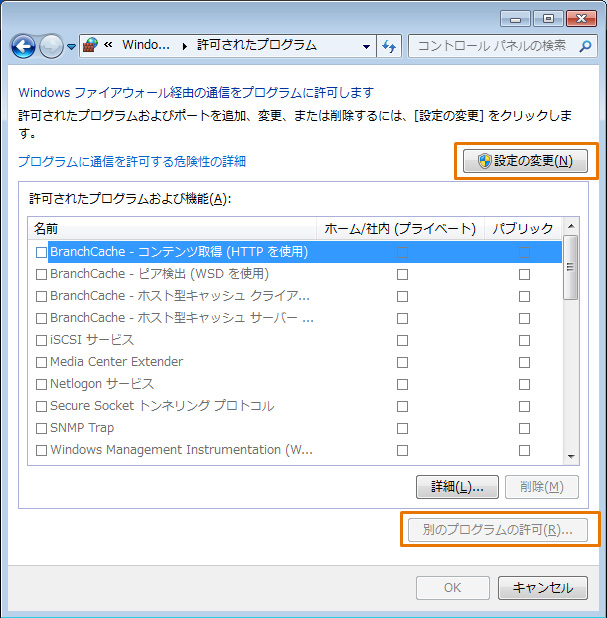 - [設定の変更]をクリック後、[別のプログラムの許可]をクリックし、[プログラムの追加]画面を開きます。