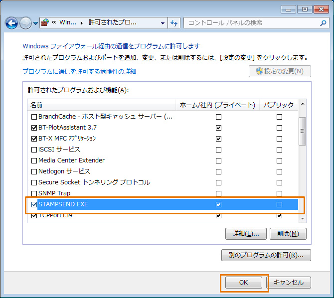 - [許可されたプログラムおよび機能]に[STAMPSEND EXE]が表示されるので、[ホーム/社内(プライベート)]または[パブリック]の欄にチェックがついていることを確認します。チェックがついていない場合、手動でチェックボックスにチェックを入れ、「OK」ボタンを押して終了です。