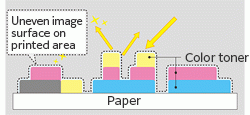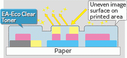 For example, the gloss on the print surface of printed photographs must be uniform. As shown in Fig.1, the printed image surface on paper is uneven due to the different amounts of toner placed. However, as shown in Fig.2, the image surface can be made smoother by placing EA-Eco Clear Toner in the image area using less toner. As a result, there is a uniform reflection of light that enables the creation of print images having a uniform, high-level gloss.