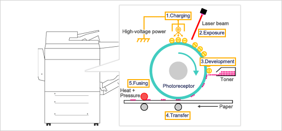 In xerography, printing is performed by five processes (1. charging, 2, exposure, 3. development, 4. transfer, 5. fusing) by using optical semiconductors called photoreceptors.