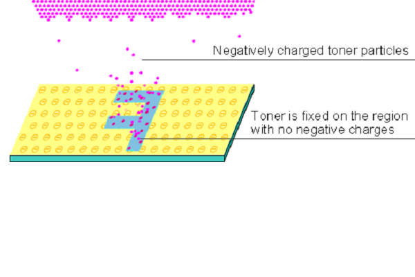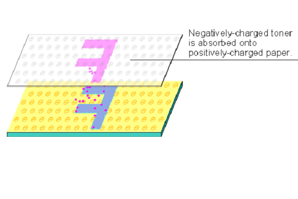 Positively-charged paper is brought close to the photoreceptor. By using the characteristic that positive charges attract negative charges, negatively-charged toner is absorbed onto paper.