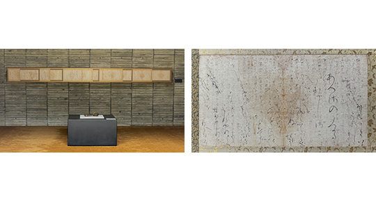 (3) Replica of "Denfujiwaranoyukinarihitsukanashosoku", housed in Kyukyodo, a stationery and incense shop in Nakagyo-ku, Kyoto. "A national treasure and a masterpiece from the late 11th century, showcasing the elegance of kana script from the Heian period."