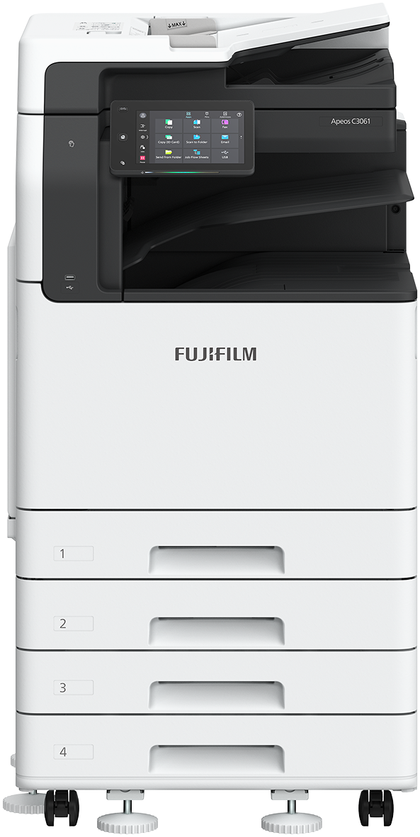 - The Apeos C3061 series comes with the basic functions of copying, printing, and scanning, capable of supporting wide range of paper, even though the main unit has become smaller and lighter*18 compared to our previous series*12. The series allows customers to choose from a total of four tray configurations, from one-tray to four-tray. With the addition of the newly developed Finisher-A3, customers can have two-way output in the main unit. Therefore, customers can freely combine them to suit the location where the multifunction device is installed and the customer's usage.