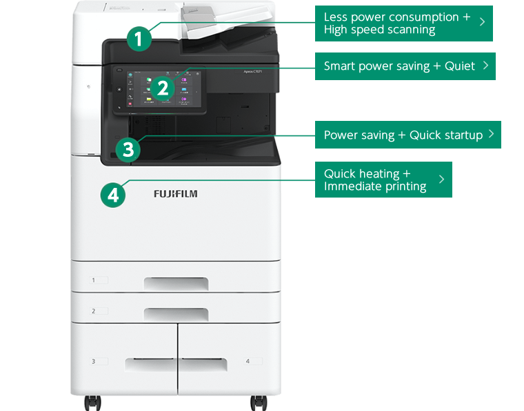 Smart WelcomEyes, which detects user presence to automatically exit sleep mode, combines "energy saving" with "ease of use." The "Instant Heating IH-Fuser"*5 enables recovery from sleep mode in less than 5 seconds, providing low power consumption while ensuring immediate availability when needed.