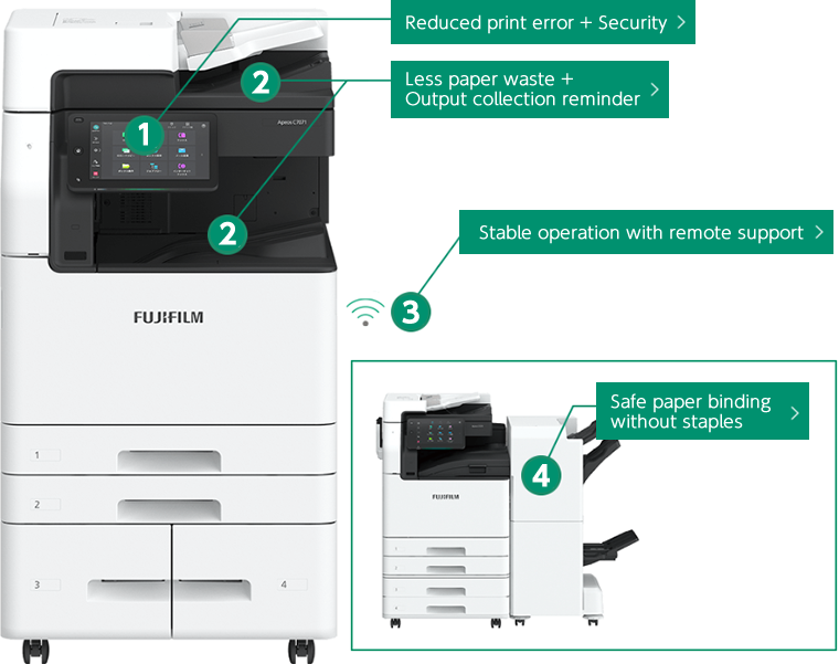- *2: Based on the results of staple-free stapling used in the Apeos C7070 series and Apeos C8180 series installed at customers' sites in Japan (September 2022 to March 2023), the number of staples reduced is approximately 180,000, or 6.8 kg when converted to weight.