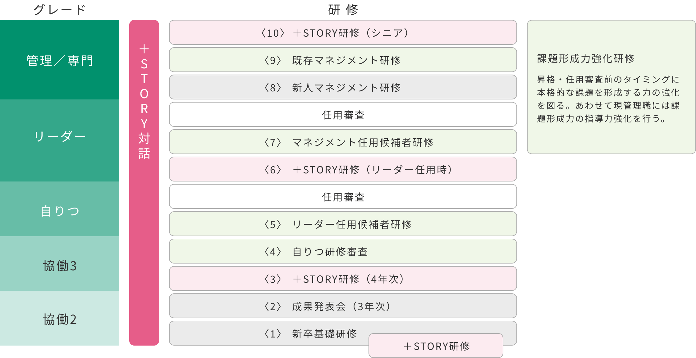 社員一人ひとりの成長に向けて主体的な学びを支援・促進するための学びのプラットフォームです。上長との+STORY対話をとおして、今後の+STORYを実現するため必要な学びを考え、「GLOBIS学び放題」(株式会社グロービス提供)、「Udemy Business」(株式会社ベネッセコーポレーション提供)のオンライン講座を通じて、ビジネススキル、MBA講座のエッセンスを中心とした専門領域や、語学やプロジェクトマネジメント、専門技術、プログラミングなどの実務領域など、2,000を超えるプログラムの中から、自身に必要な講座を自由に受講することができます。「実践」(OJT)と「学び」(OFF-JT)のスパイラルを繰り返すことで、何歳になっても+STORYを描き挑戦し続けることを促し、学び合う、教え合う風土を醸成していきます。