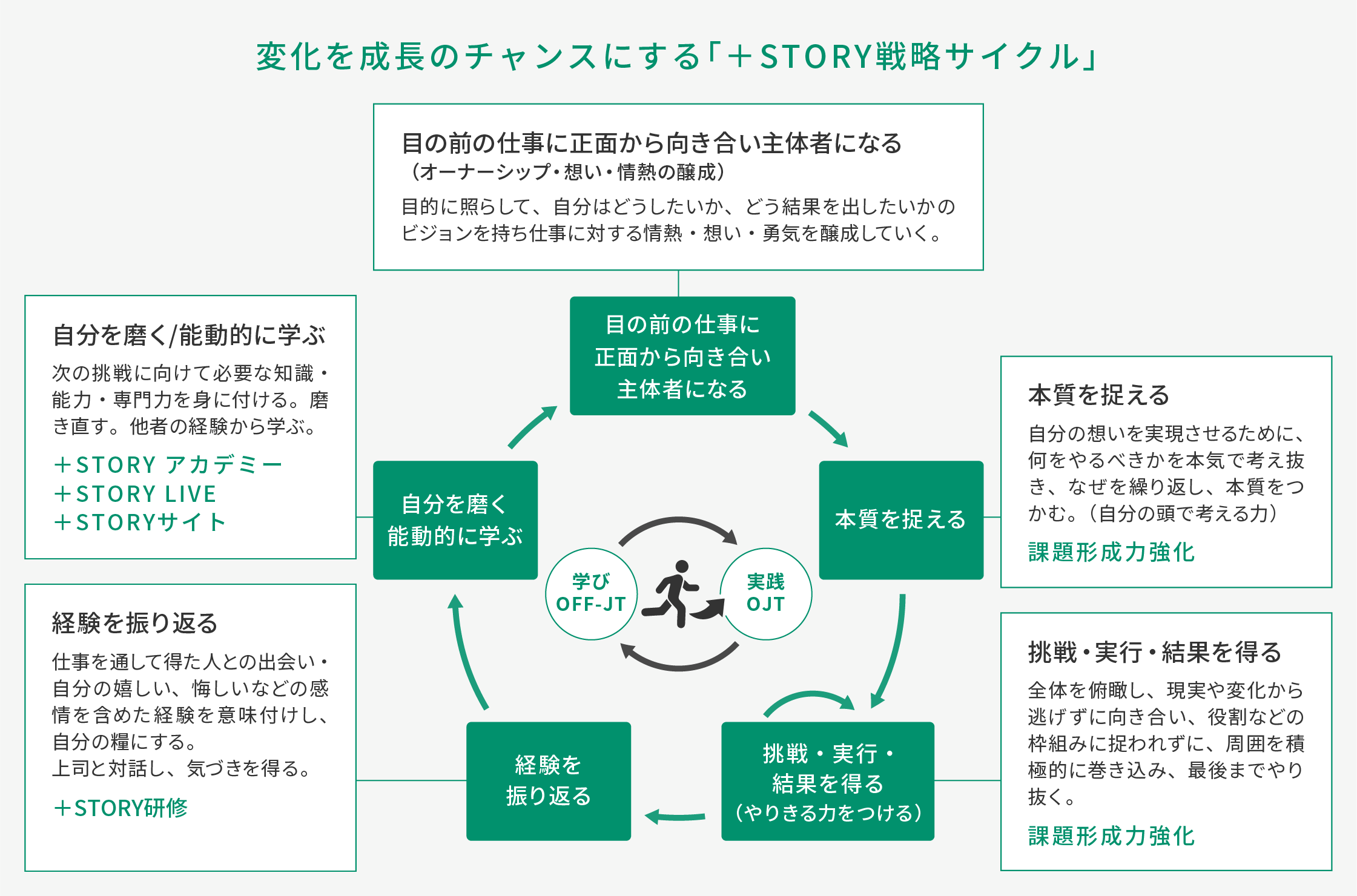 富士フイルムグループでは、目の前の仕事に一生懸命取り組む中で得られた感情や経験、人との出会いを自分の力としながら、自分の人生の物語を紡いでいくという意味から、人材の育成・成長を言い表すキーワードとして「+STORY(プラストーリー)」というコンセプトを打ち出しています。そして、このコンセプトに沿って各種施策を展開しています。