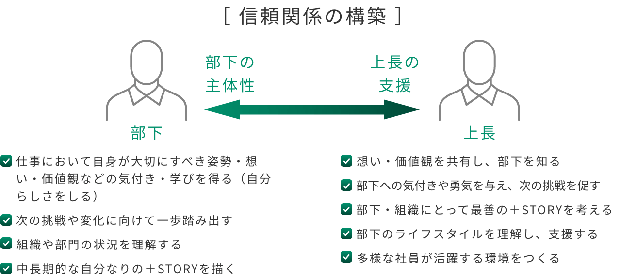 「対話」を行うことで、上司・部下が双方向のコミュニケーションを図り、お互いに新たな気づきが生まれることを重視しています。互いに自分の考えや価値観・経験(STORY)をオープンに話し、信頼関係の構築を図ることで働きやすい職場環境に繋げていきます。もちろん、すでに触れたように、本人のキャリア意向を、人材育成会議を通じて実現していく仕組みでもあります。
