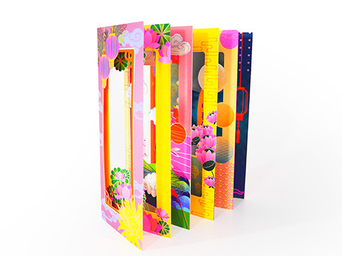 作品説明:中国や台湾などの伝統的な行事「中秋節」で、中秋の名月を祝うために食べるお菓子「月餅」の商品化粧箱。特殊トナーを活用した鮮やかな色彩と、入り組んだデザインが組み合わされた箱の豊かな色合いが、月餅が象徴する、繁栄や幸せ、幸運を表している。ダイカットしたモチーフのデザイン性も高く、独創性と技術の高さが目をひく作品。「特殊色の活用」部門で第1位を獲得。