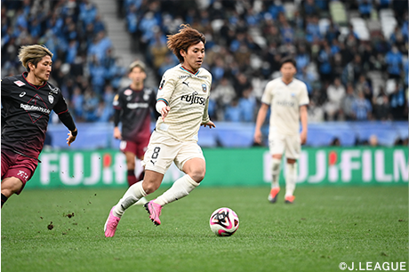 48分、川崎Fが右サイドのタッチライン際浅い位置でFKを得る。キッカーの瀬古 樹が鋭いボールを送ると、神戸は前川がはじき、キャプテンの山口がクリアを試みる。しかしファンウェルメスケルケン際があきらめずに体を寄せると、ボールは右足に当たり、相手のブロックをすり抜けてゴールへ。高校卒業から父親の母国であるオランダでの10年半のプレーを経て、今季川崎Fに加入した異色のSBが、プロとしての日本国内初戦でゴールを決めた。