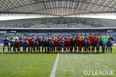 日本高校サッカー選抜(高校選抜)がU-18Jリーグ選抜(J-18)を振り切って2-1と競り勝ち、通算成績を4勝3分2敗とした。前後半40分の試合で均衡が破れたのは26分。第96回全国高等学校サッカー選手権大会優勝の前橋育英高で活躍したFW飯島陸が右サイドからゴール前に折り返すと、走り込んだMF井上怜(市立船橋高)が決めて高校選抜が先制した。36分には、ゴール前の混戦から飯島が巧みなシュートでゴールネットを揺らし、2点をリードした。一方、J-18は後半に入って反撃の勢いを増し、アディショナルタイム2分には左サイドからのFW棚橋尭士のクロスをFW原田烈志が合わせて1点差としたものの、あと一歩及ばなかった。