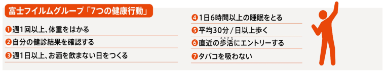 それらの基盤強化の為、富士フイルムグループでは「従業員の健康維持増進」を重要な経営課題と捉え、2019年には「富士フイルムグループ健康経営宣言」を制定し、健康経営®に関する5つの重点管理項目(生活習慣病、がん、喫煙、メンタルヘルス、長時間労働)と年間の目標値を各社で定め、全社あげて様々な活動に取り組んでいます。
