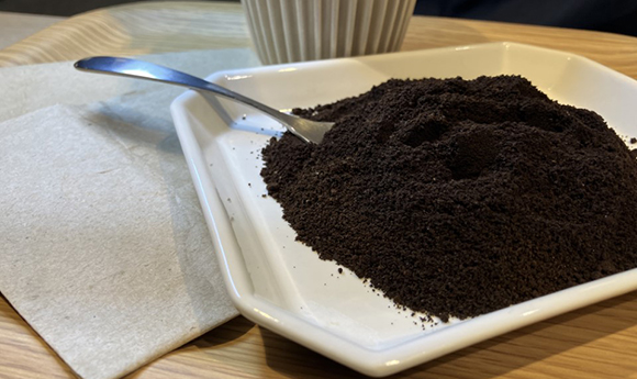 店内で提供したコーヒーの粉を消臭剤に生まれ変わらせています。ご自由にお持ち帰りいただけます。