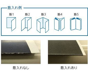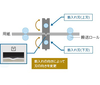 パンフレットなどの表紙やカードの折り目に予め筋入れを行うことで、トナー割れが発生するのを抑制し、印刷物の品質を高めます。筋入れは、山折り・谷折りなど、折りの方向によって、筋入れの刃の向きを変更することで実現します。用紙1枚に最大5本の筋入れを自由に加工でき、用紙の厚さに応じて筋入れの強さを調節することが可能で、蛇腹折りなど多種の折りを実現しています。