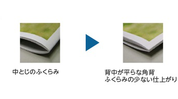 中綴じ冊子では、ページ数の増加により冊子の背に膨らみが発生します。そこで、冊子を上下のクランプで固定し、潰しローラーを背の部分に当て圧力をかけることで、冊子の背の形状を平らにする角背仕上げを行います。この処理により、冊子の膨らみが低減し、高品質な製本処理を実現します。