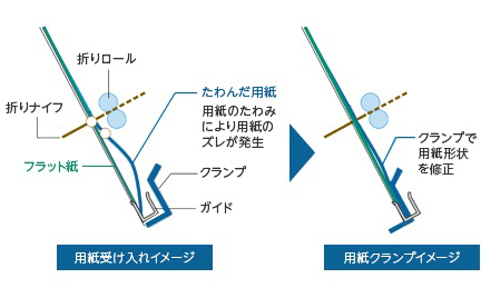 中とじ製本部では、ステープラーと折りロールの配置を変更し、用紙を揃えるタンパーを長尺にすることで、大サイズの用紙揃え精度を向上しています。また、環境変化の影響による用紙のカールに対しては、用紙を抑えるクランプ機能を追加し、用紙のたわみなどによる位置ズレを改善します。用紙を正しい位置に配置でき、用紙の折り精度も向上します。