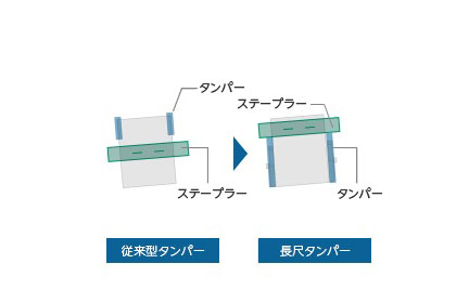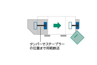 用紙揃え部のタンパーを両側駆動にすることで、用紙排出位置で用紙揃えを行うことが可能です。さらに、コーナー綴じでは、冊子ごとタンパーで挟みステープラー位置まで束移動させるため、用紙の横移動を最小限に抑えます。これにより、後処理の高速化と耐カール性の向上、小サイズの用紙揃えが可能になり、用紙汎用性を実現しています。また、用紙揃え部の直前に搬送用紙を一時的に2枚格納できるバッファー機能を設け高生産性を実現するため、バッファーパス内の搬送抵抗の低減と駆動制御の最適化により、重ね合わせた用紙のズレを防止し、複数枚の用紙を搬送し同時に揃えを行っています。